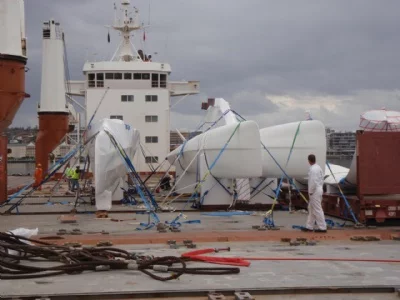 Oman Sail’s Arabian 100 trimaran has been loaded onto a ship and is now heading for Oman’s southern city of Salalah for assembly. The Arabian 100 was built at Boatspeed in Newcastle, Australia, the same yard as many famous yachts but none more so than Oman Sail’s current flagship, the 75’ trimaran Musandam which started life in 2004 as Ellen MacArthur’s B&Q/Castorama. Final assembly will take place in Salalah, Oman’s second city and home of the Sultan of Oman, Qaboos Bin Said. Final assembly will employ a workforce, which will include Omanis who have chosen the boatbuilding and shore management route to compliment the Omani sailors who will help sail the Arabian 100 on completion.
