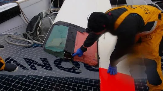 After running into an ‘unidentified floating object’ overnight from Wednesday to Thursday, Pascal Bidegorry and his men had to head North for a while, in order to reach better sea and wind conditions to lift the daggerboard out of its case and evaluate the extent of the damage. The operation, which took about three hours, showed that the impact tore 2m20 of the submerged part and confirmed the disappearance of the crashbox. Brought back on deck, the daggerboard currently takes full attention from the Maxi Banque Populaire V crew, which is doing everything possible with the means available on board to get back to normal racing on this Jules Verne Trophy.