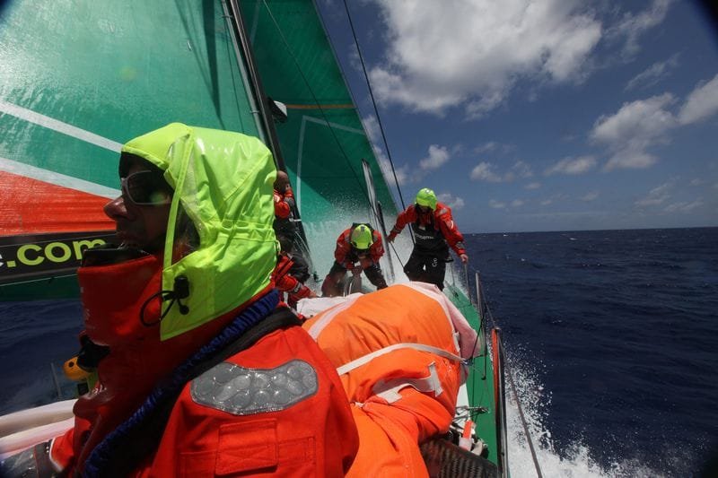 Ian Walker, the skipper of Abu Dhabi announced that the formation of a tropical wave could reshuffle the cards as they pass through the Doldrums. In line with this, the Spanish on Telefonica and the New Zealanders on Camper have curved their route inwards over recent hours, which would suggest that they’re keen to attack the ITCZ at 72° East. Indeed it would appear that another way through is opening up at 75° East, but this involves extending the trajectory with a more easterly exit from the Doldrums and hence a final beat to round off the leg.