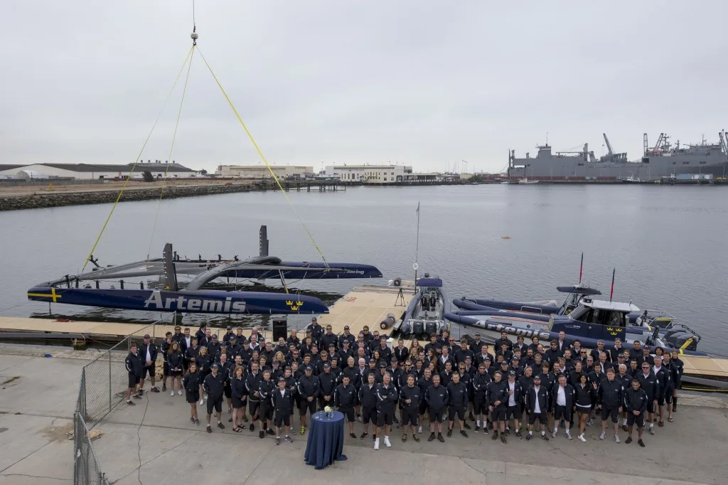 Artemis Racing held a private team gathering this morning at its base in Alameda to christen the team’s second AC72.