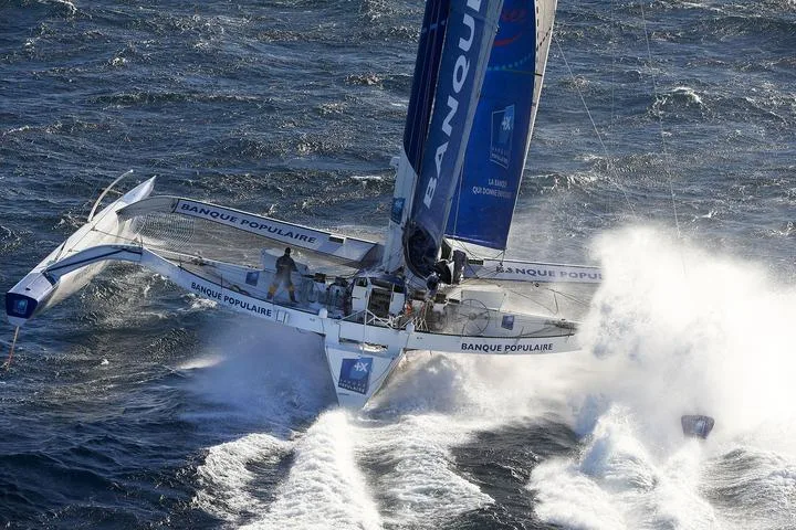 Banque Populaire VII crossed the finish line last night at 19:39:17 UTC, making her elapsed time for the course just 6 days 23 hours 42 minutes and 18 seconds. Along the direct route of 3,884 miles, she averaged 23.16 knots but she really sailed 4271 miles at an average speed of 25.47 knots.