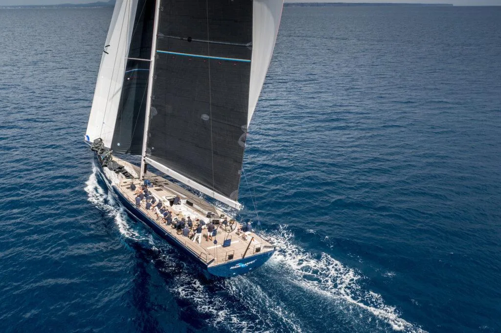 Today’s race was a 19 mile coastal course in sub-10 knot conditions. As usual the two largest yachts, the Wallycentos Magic Carpet Cubed and Galateia were at each other’s jugulars. On this occasion it was Sir Lindsay Owen-Jones’ blue-hulled giant that made the best of the first upwind to lead around the top mark. However Galateia was swifter to dowse her Code 0 at the next turning mark, and managed to nose ahead, further helped when Magic Carpet Cubed chose to take the inshore route down the west coast of the Bay of Palma and was becalmed for a few minutes. However she subsequently came back strongly. The match racing between the two 100 footers continued right up to the finish line.